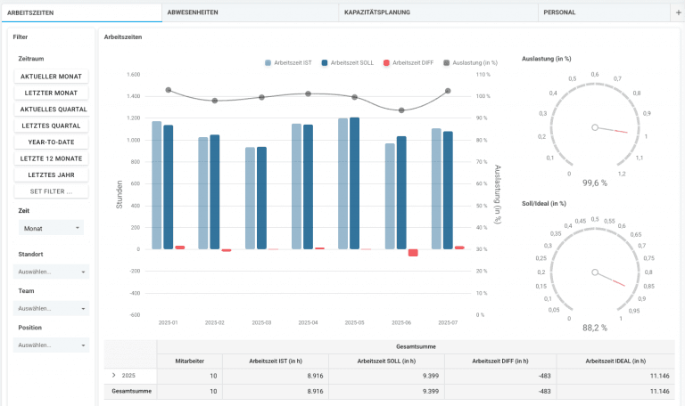 - Arbeitszeit-Auslastung in % → wie viel der Idealzeit wirklich genutzt wird