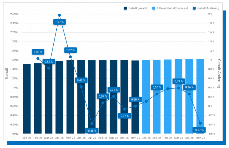 Das System prüft, wie sich ein Gehalt zuletzt verändert hat und ob ein klarer Trend sichtbar ist. Bei stabilen Verläufen wird der letzte Wert übernommen, bei erkennbaren Veränderungen berechnet der Forecast eine Trendlinie über die letzten Monate. Auch Sonderfälle wie FSJ oder Azubi Stellen bleiben konstant. Veränderungen im Beschäftigungsumfang durch Ein- und Austritte werden automatisch berücksichtigt, sodass sich jede Stundenanpassung sofort im Forecast widerspiegelt.